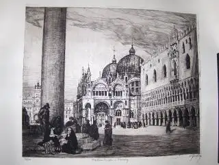 OSKAR GRAF *. ORIGINAL -RADIERUNG (leicht braun.-Aquatintaradierung): "Markuskirche in Venedig" mit Scene auf. d. Markusplatz. Signiert - Numer. 36/100