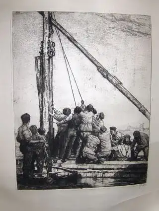 OSKAR GRAF *. Gr.-ORIGINAL -RADIERUNG (leicht braun.-Aquatintaradierung) ohne Titel: 13 Arbeiter (Teils stehenden u. T. sitzenden) an einem Seilzug, nahe an einer Stadt... Signiert unten rechts - Numer.: 2