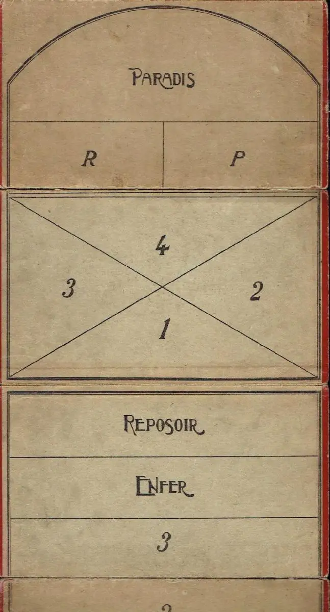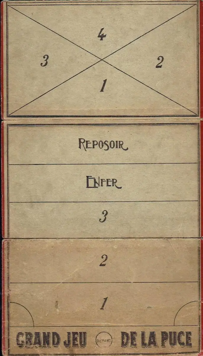 schlechter bis mittlerer Zustand, Gebrauchs- und Alterungsspuren: die beiden äußeren Falze teils erheblich gerissen - Rückseite beschabt - Ecken und Kanten teils mehr oder weniger abgenutzt - unteres Feld quer angeknickt und an beiden Ecken angebrochen - Oberfläche gebräunt / verschmutzt, geliefert wird nur dieses alte Spielbrett (ohne Figuren, Würfel und Verpackung) Hersteller und Alter unbekannt, kartoniert, ca. 22,5 x 13 (ausgeklappt ca. 52,5 x 13), 4-teilig