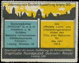 Internationale Baufach-Ausstellung, Generalpächter Epoche GmbH Frankfurt/M. Größtes Reklame-Unternehmen Süddeutschlands, Filialbüro Leipzig, Weststr. 18, Größe/Zustand: 7x8 , guter Zustand, Original alte Reklamemarke die seinerzeit für die Werbung benutzt wurde