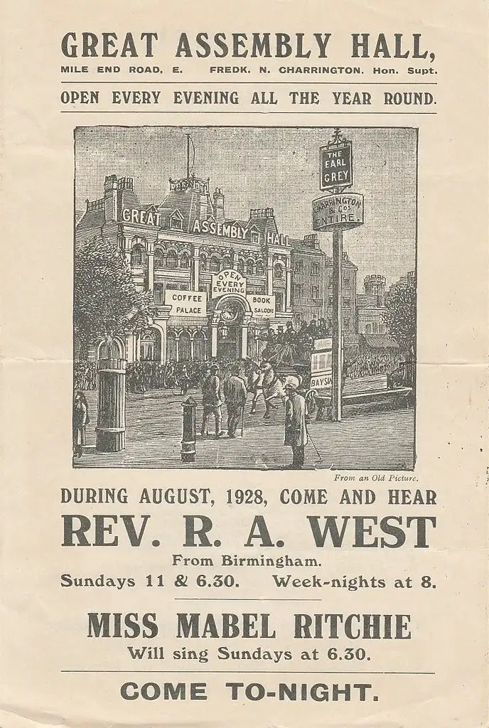 Great Assembly Hall Mile End Road: Programmzettel August 1928 REV. R. A. WEST / MISS MABEL RITCHIE.