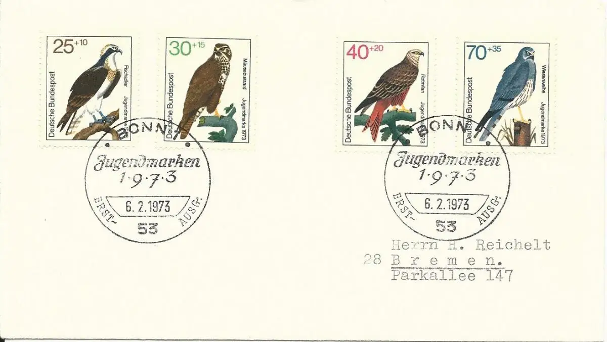Fischadler, Mäusebussard, Rotmilan u. Wiesenweihe, BRD-Jugendmarken 1973 auf FDC (Mi. 754/57).