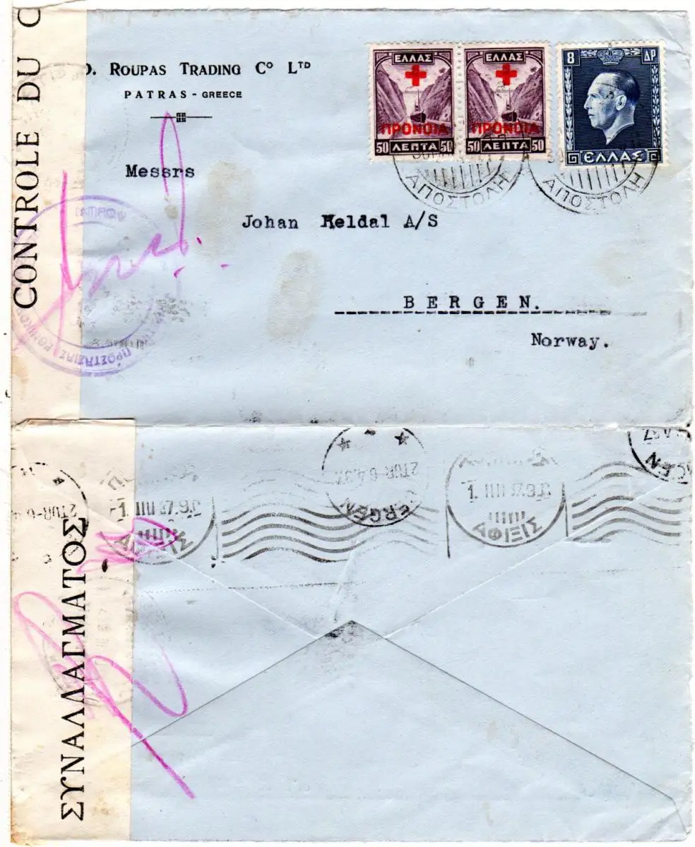 Griechenland 1937, 3 Marken auf Zensur Brief v. Patras n. Norwegen.