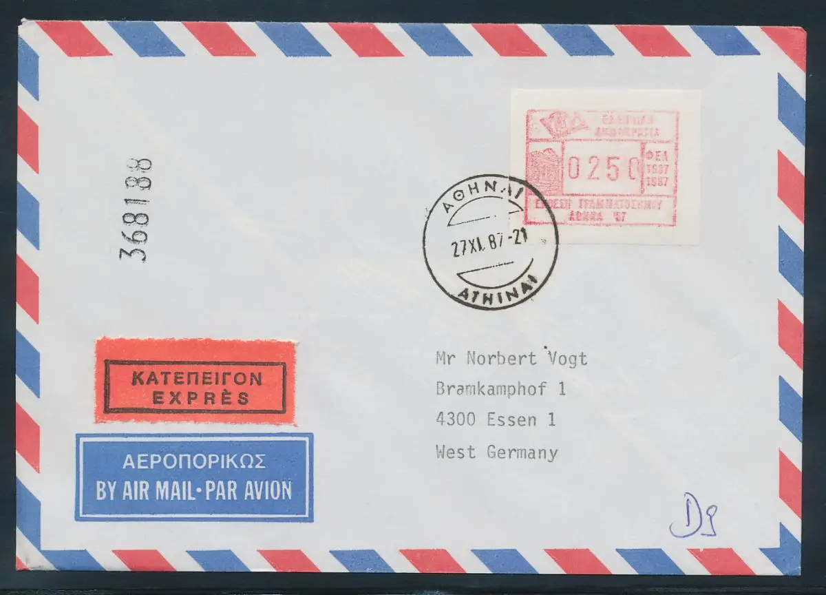 Griechenland: Frama-Sonder-ATM ATHEN'87 z-Papier Wert 0250 auf Express-Brief.