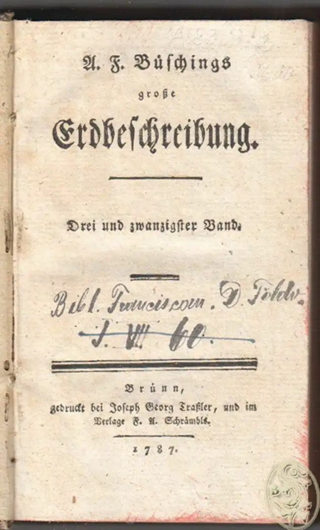 Brünn, Traßler/Schrämbl 1787. Erste / Zweite Abtheilung. 2 Bde. 8°. 557; 512 S. Pbde. d. Zt. Mit Rückensch., Innendeckel gestemp., Tit. m. hs. Bibliothekssignatur. In gutem Zustand. - (Büschings große Erdbeschreibung. 23., 24. Bd.)