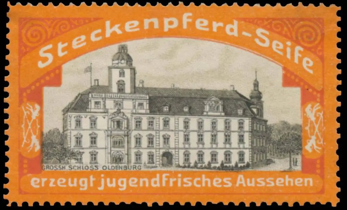 Steckenpferd-Seife, erzeugt jugendfrisches Aussehen. Orange, Größe/Zustand: 3x5 , leicht beschädigt, Original alte Reklamemarke die seinerzeit für die Werbung benutzt wurde