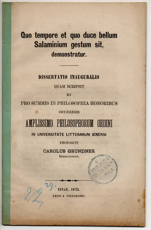 Grundner, Karl: aus Braunschweig: Quo tempore et quo duce bellum Salaminium gestum sit, demonstratur. Dissertation.
