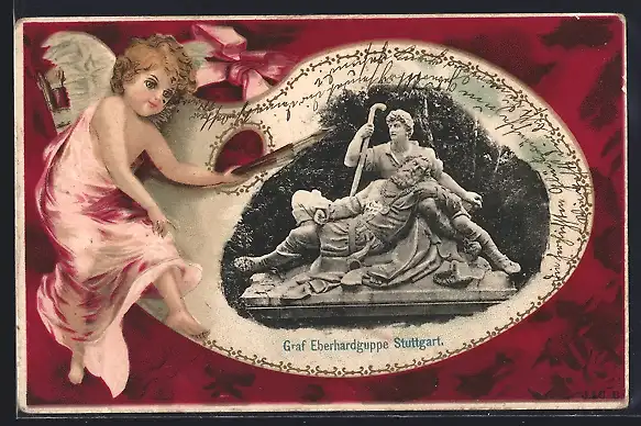 Grusskarten-AK Stuttgart, Graf Eberhardgruppe, Ansicht auf Malerpalette mit Engel