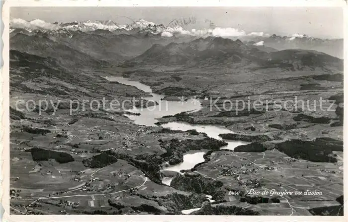 Gruyeres_FR Lac de Gruyere et les Alpes vue aérienne Gruyeres FR postalisch gelaufen 1921-1965 Erhaltung siehe scans [FriedD77] Frierer