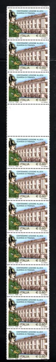 MNH - Vollgummi - - Guardia di Finanza Euro 0,60 Nr. 2918 vertikaler Streifen von zehn Exemplaren, davon drei durch Gruppenzwischenräume unterteilt (Kat. Einheitsnr. 2963 n. Chr.) - stammt aus dem einzigen bekannten Bogen mit Schrägschnitt - Selten, 5 vorhanden aus dem einzigen Blatt - Cert. Ray. gold - Kat. euro 1.500 Cod.805/182