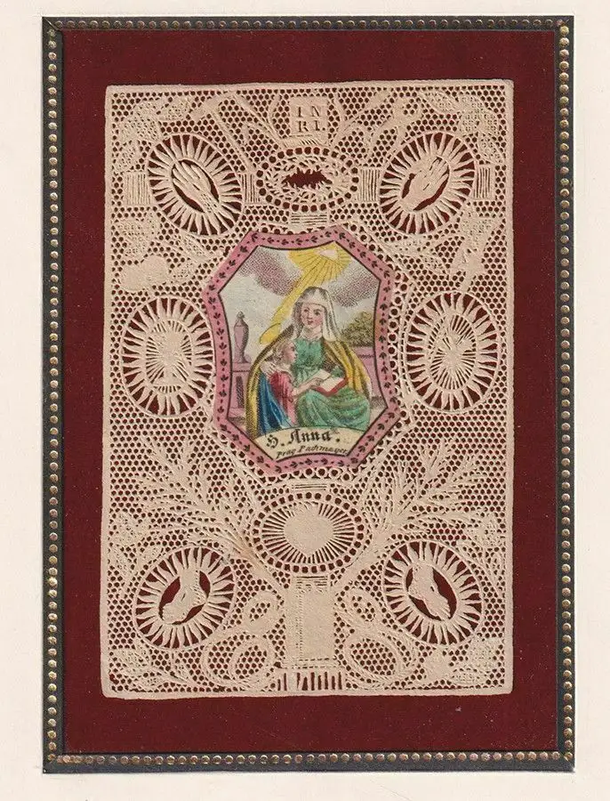 Bemerkungen: Dargestellt ist mittig die Heilige Anna mit ihrer Tochter Maria. Die Stanzspitze imitiert ein Kreuz mit Dornenkrone und den stigmatisierten Händen und Füßen Christi. Der Gedenktag der Heiligen Anna ist der 26. Juli.