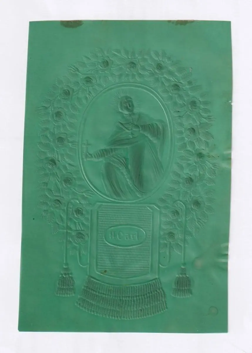 o. O., [um 1860]. Grünes, reliefgeprägtes Zelluloid (?). 10,8 x 7,3 cm. (Blattgr.). Gut erhalten.
