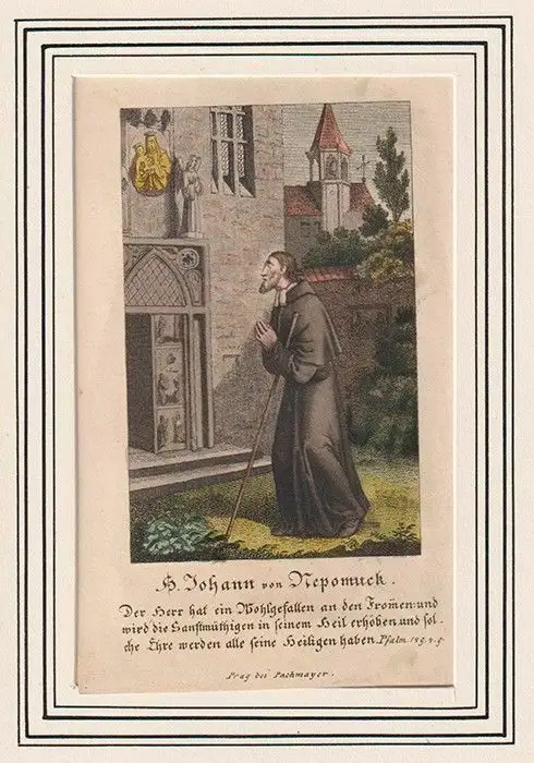 Bemerkungen: Dargestellt ist der Brückenheilige Johannes von Nepomuk (1350-1393) vor einer Kirche.Über dem Kirchenportal ist ein goldenes Mardonnen-Gnadenbild zu sehen. Johannes, der im Betgestus zu sehen ist, hat den Blick zum Gnadenbild gewandt. Er erlitt sein Martyrium, indem er in Moldau geworfen wurde. Vorangegangen war eine Auseinandersetzung mit König Wenzel und dem Prager Erzbischof Jenzenstein. Der Gedenktag der Heiligen Johannes von Nepomuk ist der 20. März.