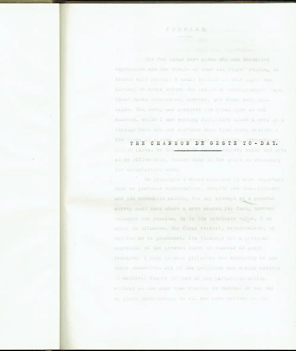 guter bis sehr guter Zustand, geringe Gebrauchs- und Alterungsspuren: Buch etwas verzogen / gewölbt - Einband teils etwas vergilbt / leicht verschmutzt - Seiten sauber und ordentlich, Manuskript, maschinegeschrieben und gebunden, der Name des Autors (?) steht nur auf dem Buchrücken zur Datierung: keine Literaturangabe ist jünger als von 1935 "The few ideas here given shy and tentative expression are the result of some six years' reading in French epic poetry. A small section of this Layer was already in notes before the end of my undergraduate days. Other tasks intervened, however, and these were laid aside. The essay has received its final form at odd moments, while I was working forty-five hours a week in a foreign Bank and has suffered much from being written a few lines at a time, principally in trains, restaurants, public parks. by the wayside during country walks and even at my office desk, rather than in the quiet so necessary for satisfactory work. On principle I would consider it more important than my previous dissertation, despite its insufficiency and its schematic nature, for any attempt at a general survey must rank above a mere search for fact, however valuable its results. As to its intrinsic value, I am under no illusion. The final verdict, nevertheless, is not for me to pronounce. Its findings are a personal appraisal of the present state of chanson de geste research. I hope to have preferred the authority of the texts themselves and of the political and social history of medieval France to that of any particular critic,without at the same time wishing to conceal in any way my great indebtedness to all who have written .." "It is this curious coincidence - at first it seems little more - that may give the key to a different conception of the epic in France, a conception less unified and less perfect in form than that of Bédier, but more in accordance with reality and with the general trend of research. These three poems, "Roland", "Guillaume" and "Gormond et Isembard" are all contained in manuscripts of Angle-Norman origin, clothed in a superficial facing of Angle-Norman forms. Of anything corresponding to them there is no trace in Continental sources until the undoubtedly later re-written versions, contemporary with the mass of the chansons we know. Using Continental manuscripts only, the earliest certain chapter in the history of the chanson de geste must remain untold. Why have these texts of undisputed French origin left no trace in their own land? The argument "ex silentio" is indeed a poor one for s period when evidence is so fickle. In itself the situation is not unparalleled, as the survival of German epic in the Edda shows the same process active in an even more remarkable way, bridging a far wider gap of intervening time and distance. Logically it can only be explained in one of two ways ..." Wikipedia: "Die Gattung der Chanson de geste (von lat. gesta „Kriegstaten“) zählt zu den ältesten erzählenden Gattungen der französischen Literatur. Ihre Entstehung fällt in das 11. oder sogar schon 10. Jahrhundert, doch ist ihre Blütezeit das 12. Jahrhundert. Die spätesten Chansons dieser Gattung entstanden im 13. Jahrhundert, die Stoffe und zentralen Figuren der langlebigen Gattung dienten jedoch noch bis ins 15. Jahrhundert hinein als literarisches Material. Sprachlich sind sie zum Teil der Altfranzösischen und zum Teil der Okzitanischen Sprache zuzuordnen ...", Leinen, ca. 21,5 x 30, 54 Seiten + 2 Seiten Vorwort
