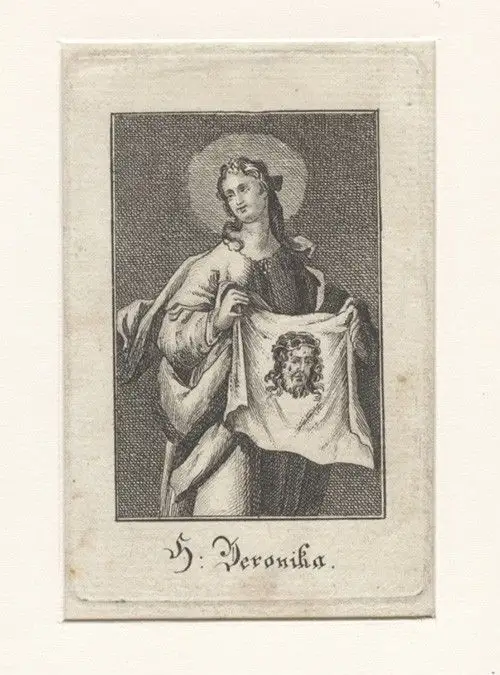 Bemerkungen: Veronika hält das Schweißtuch (Sudarium Christi), das sog. Veronikabild. Ihr kathol. Gedenktag ist der 4. Februar.