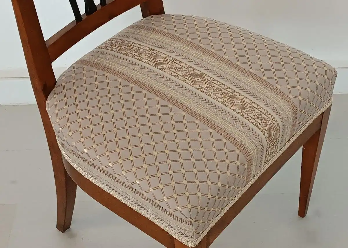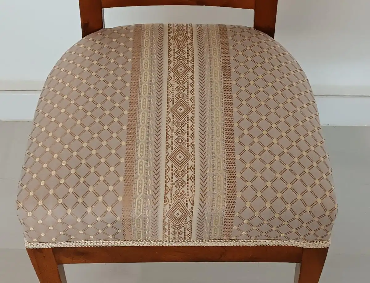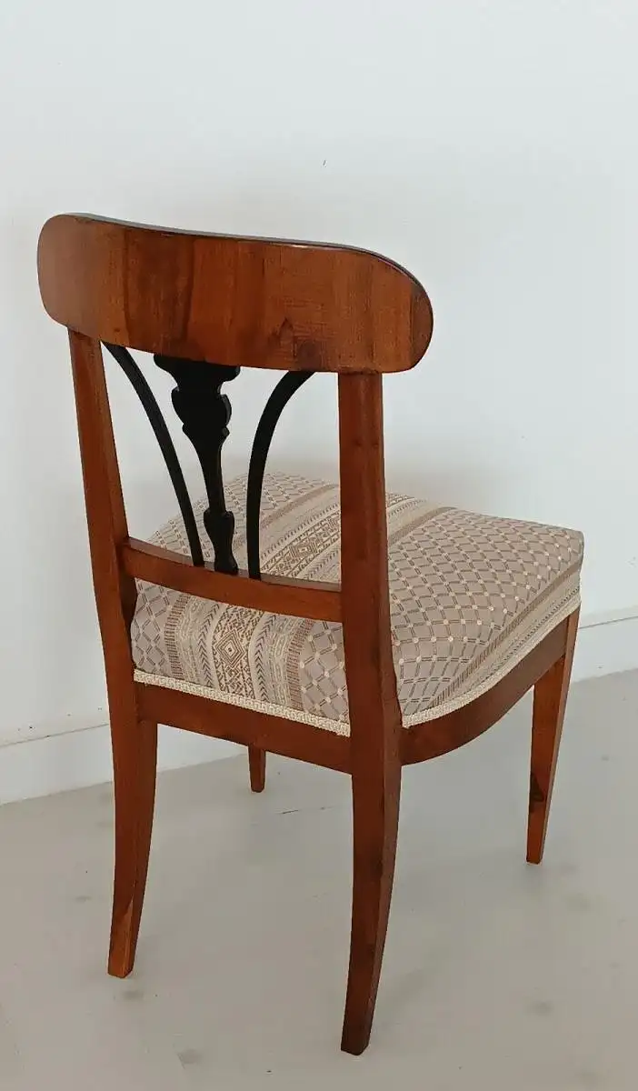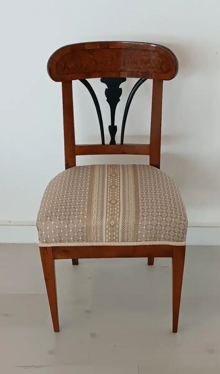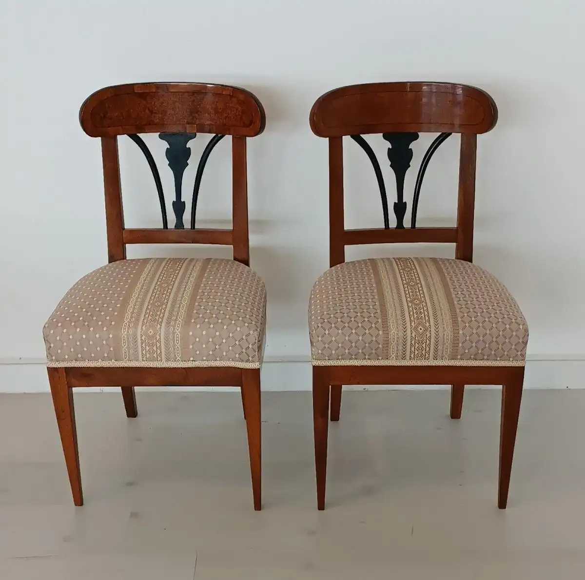 Ein traumhaftes Set bestehend aus 2 Biedermeier Stühlen, mit herrlichem Furnierbild, stabiler Korpus, dieser wurde überarbeitet und Schellack handpoliert, die gepolsterte Sitzfläche wurde mit einem wunderschönen Backhausenstoff neu bespannt, herrlicher Gesamtzustand. \n\nMaße: ca. 47 cm breit ca. 90 cm hoch ca. 50 cm tief Sitzhöhe: ca. 49 cm hoch \n\nArtikelnummer: H61276, H61277(St.) H6