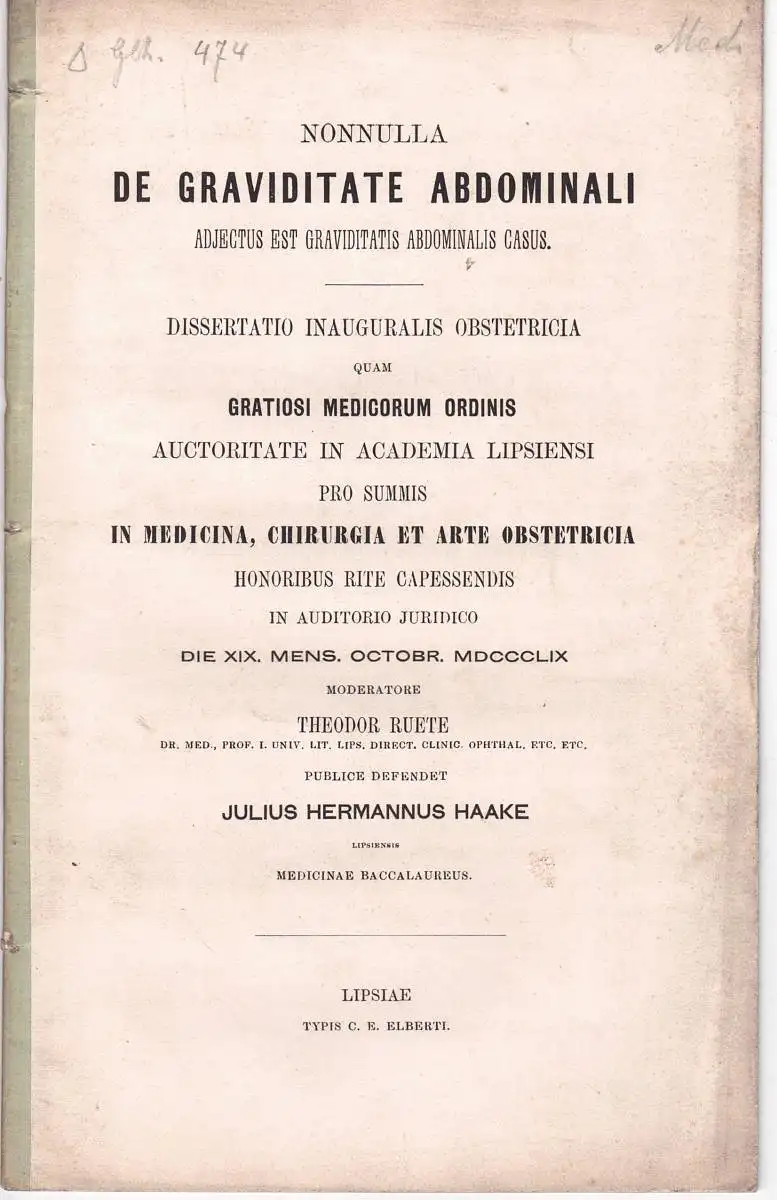 Haake, Julius Hermann: aus Leipzig: Nonnulla de gravitate abdominal adjectus est graviditatis abdominalis casus. Dissertation.
