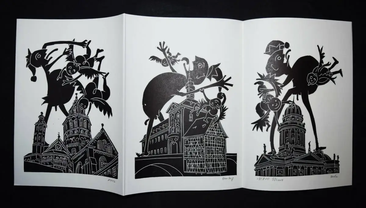 Leporellos mit jeweils 3 Linolschnitten. OPbd.
