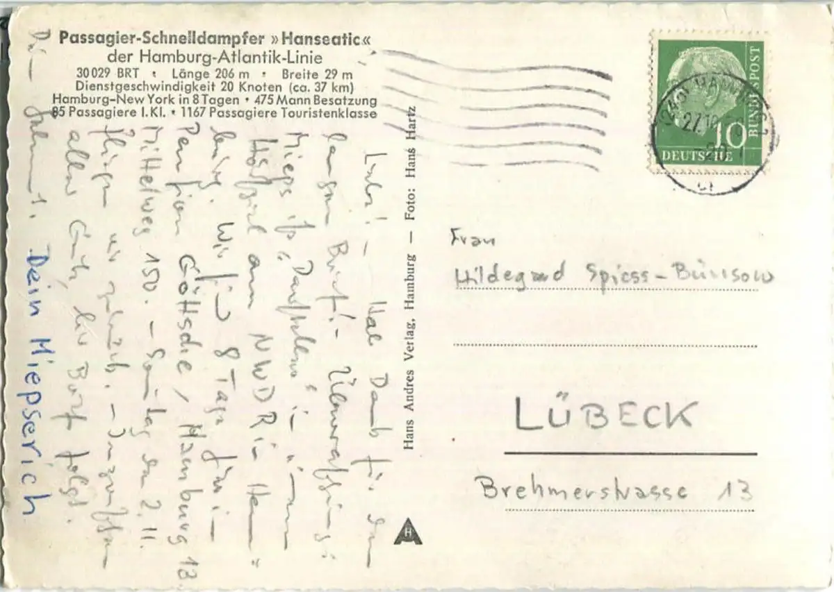 Hamburg-Atlantik-Linie - Passagier-Schnelldampfer Hanseatic - Gebrauchsspuren (G43350) gel. 1958