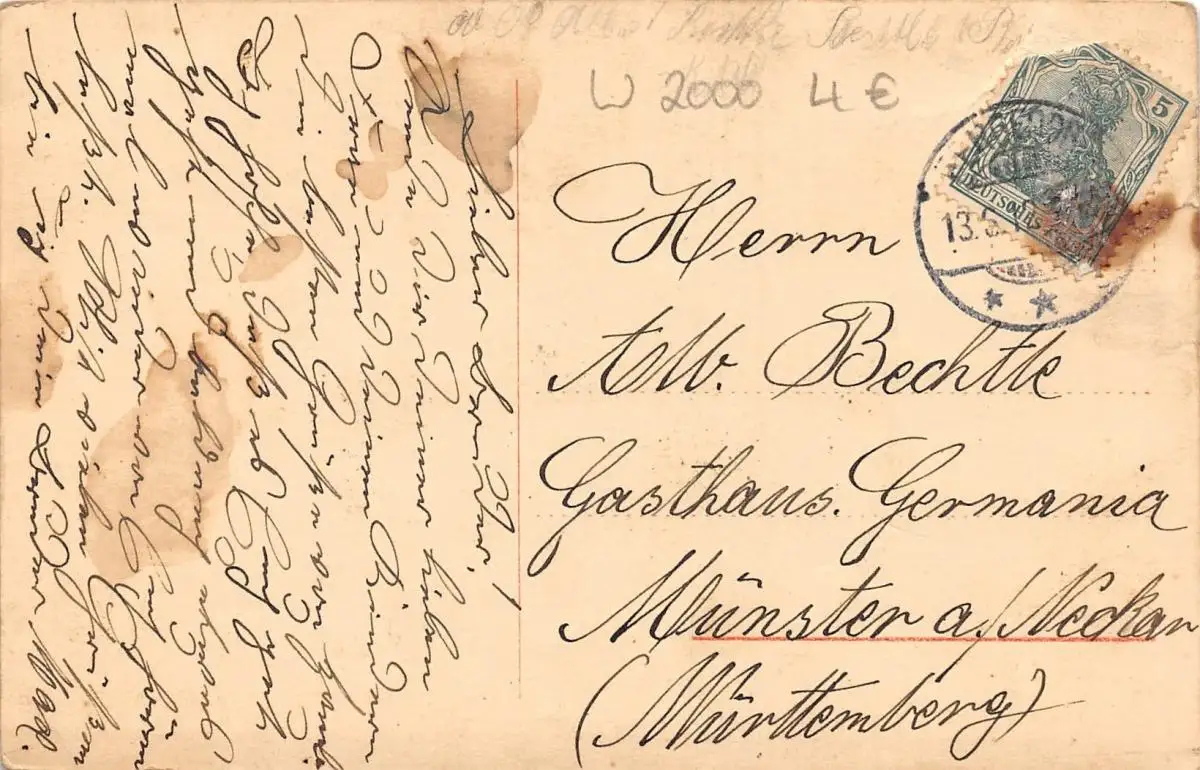 Eckknick oben links, Briefmarke beschädigt, Ecken leicht abgestoßen, Karte fleckig und lädiert