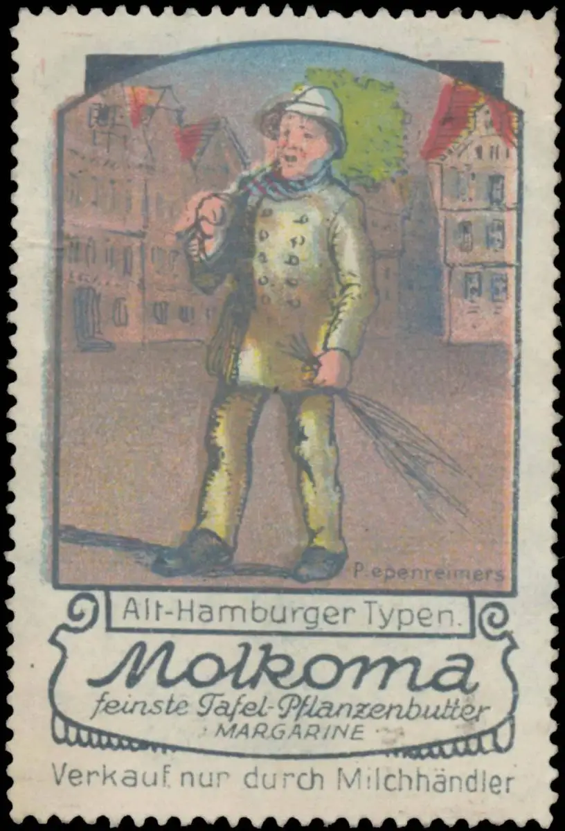 Alt-Hamburger Typen, Molkoma Tafel-Pflanzenbutter Margarine, Verkauf nur durch Milchhändler, Größe/Zustand: 6x4 , guter Zustand, Original alte Reklamemarke die seinerzeit für die Werbung benutzt wurde