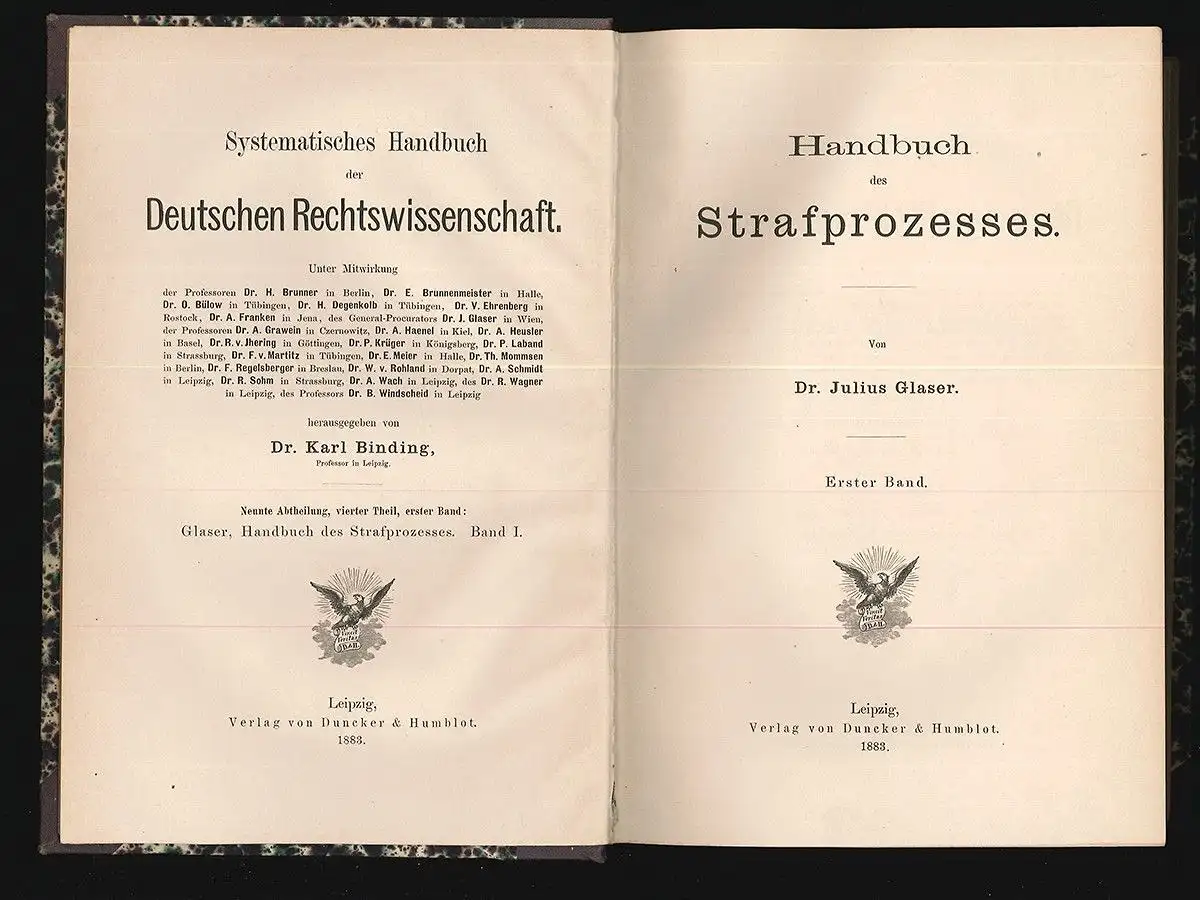 Lpz., Duncker & Humblot 1883/1885. 2 Bde. gr.-8°. XVI, 756; XII, 602 S. HLn.-Bde. d. Zt. In gutem Zustand. - (Systematisches Handbuch der Deutschen Rechtswissenschaft. Hrsg. v. Binding 9. Abt., 4. Tl., 1. u. 2 Bd.) EA.