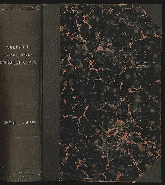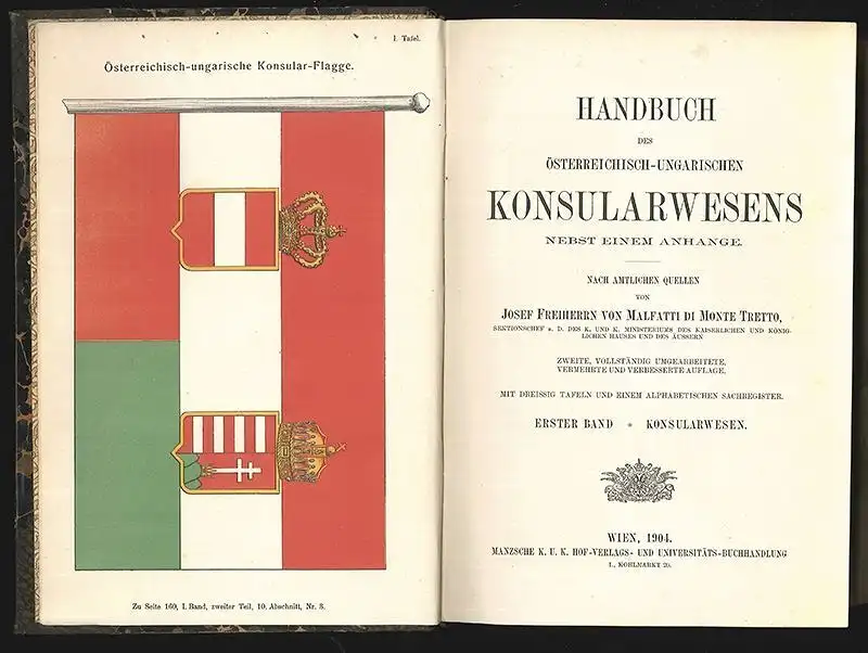 Wien, Manz 1904. 2. vollständig umgearb., verm. u. verb. Aufl. Bd. 1: Konsularwesen. Lex.-8°. XXVIII, 796 (1), 48 S. Mit 30 tlw. farb. Taf. u. Karten (lw. gefalt.). HLn.-Bd. d. Zt.. Vord. Gelenk star gelockert.