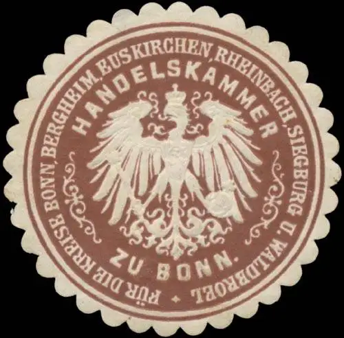 für die Kreise Bonn, Bergheim, Euskirchen, Rheinbach, Siegburg und Waldbroel, braun, weiß, geprägt, Größe/Zustand: 4 , guter Zustand, Original Verschluss-Siegelmarke aus Papier welche früher von Behörden, Firmen etc. zum Versiegeln der Briefe benutzt wurden