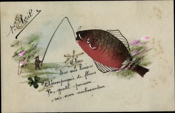 Handgemalt Ak 1. April, Ier Avril, Angler hat einen Fisch am Haken