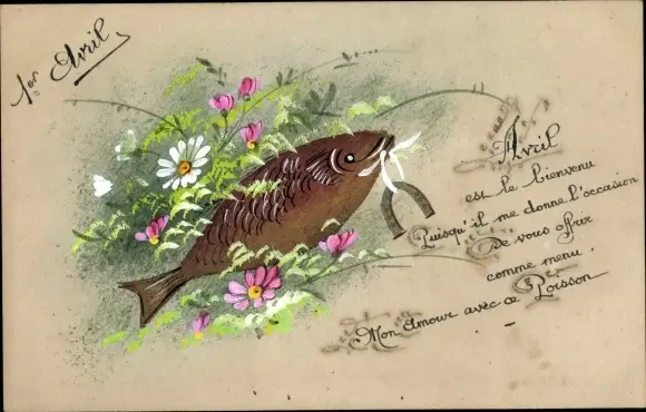 Handgemalt Ak 1. April, Ier Avril, Fisch mit Hufeisen, Blumen