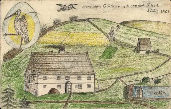 Handgemalt Ak Glückwunsch, Geburt, Dorfpartie
