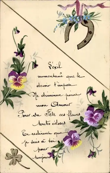 Handgemalt Ak Glückwunsch Geburtstag, Hufeisen, Blumen, Stiefmütterchen