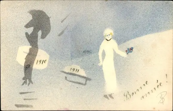 Handgemalt Ak Glückwunsch Neujahr, Jahreszahlen 1909 und 1910, Schlitten, Frau mit Blumen