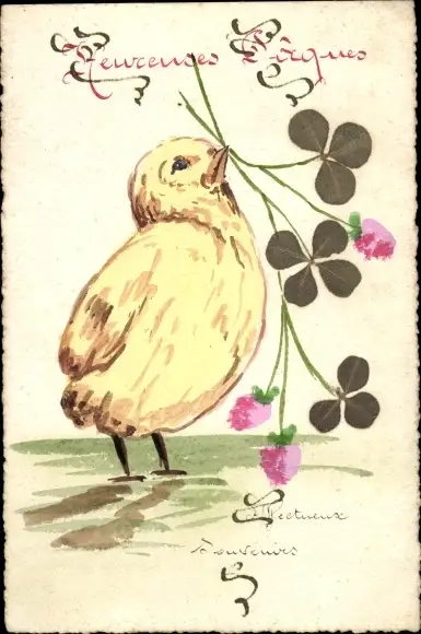 Handgemalt Ak Glückwunsch Ostern, Küken und Kleeblätter