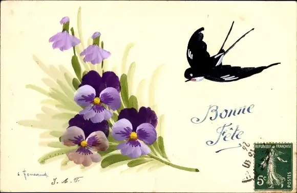 Handgemalt Ak Glückwunsch, Schwalbe, Stiefmütterchen