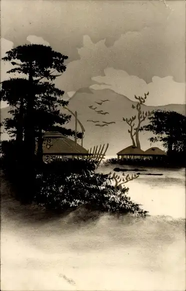Handgemalt Ak Japan, Dorfidyll, Häuser, Berg