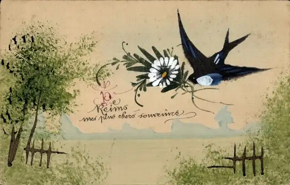 Handgemalt Ak Landschaft, Schwalbe, Blume