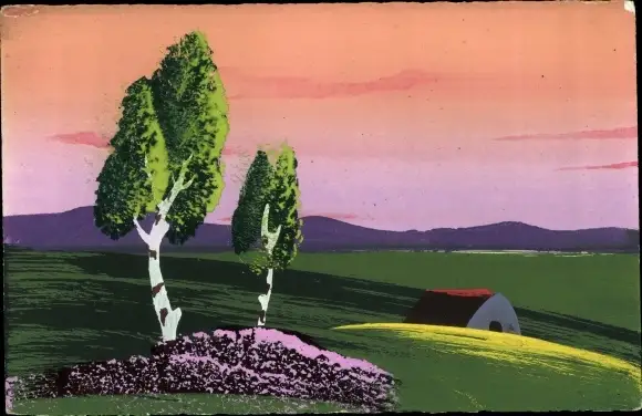 Handgemalt Ak Landschaft mit Bäumen und Haus