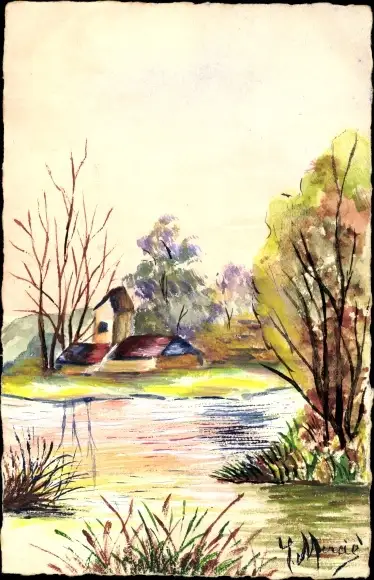 Handgemalt Ak Landschaft mit Häusern, Gewässer