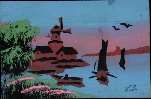 Handgemalt Ak Landschaft mit Windmühle und Gewässer, Boote