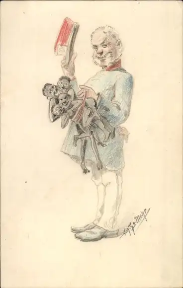 Handgemalt Ak Mann mit Afrikanern in der Hand, Karikatur Kaiser Franz Joseph I. ?