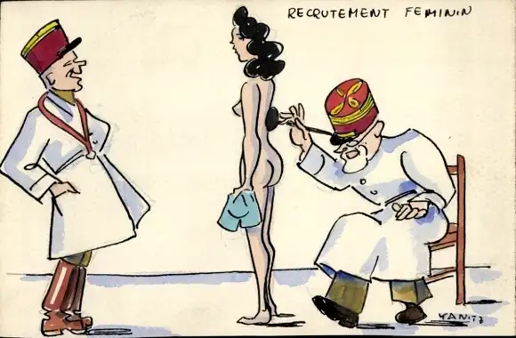 Handgemalt Ak Nackte Frau bei der Musterung, französische Soldaten