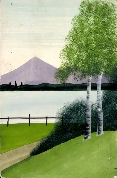 Handgemalt Ak Panorama, Fluss, Berge, Bäume