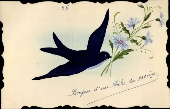 Handgemalt Ak Schwalbe mit Blumen im Schnabel