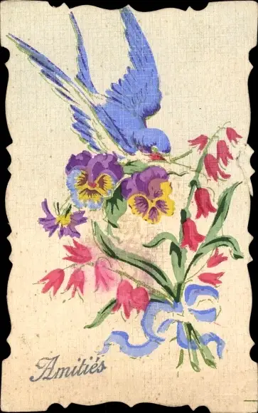 Handgemalt Ak Schwalbe, rote Blüten, Stiefmütterchen