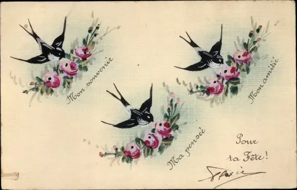 Handgemalt Ak Schwalben, Rosen, Kitsch, Glückwunsch