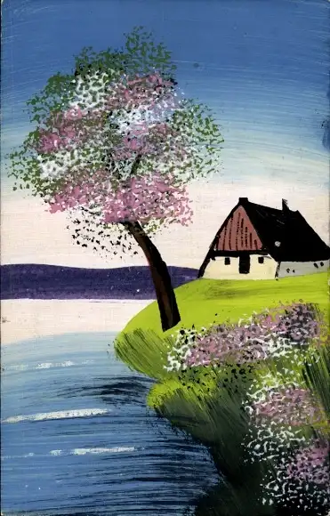Handgemalt Ak See, Uferpartie, Wohnhaus, Baumblüte