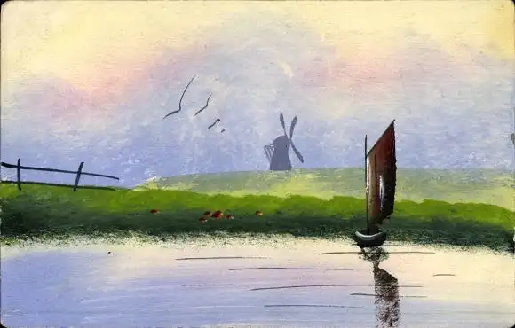 Ansichtskarte, Postkarte, Windmühle, Windmühlen, Hafen, Schiffe, Boote