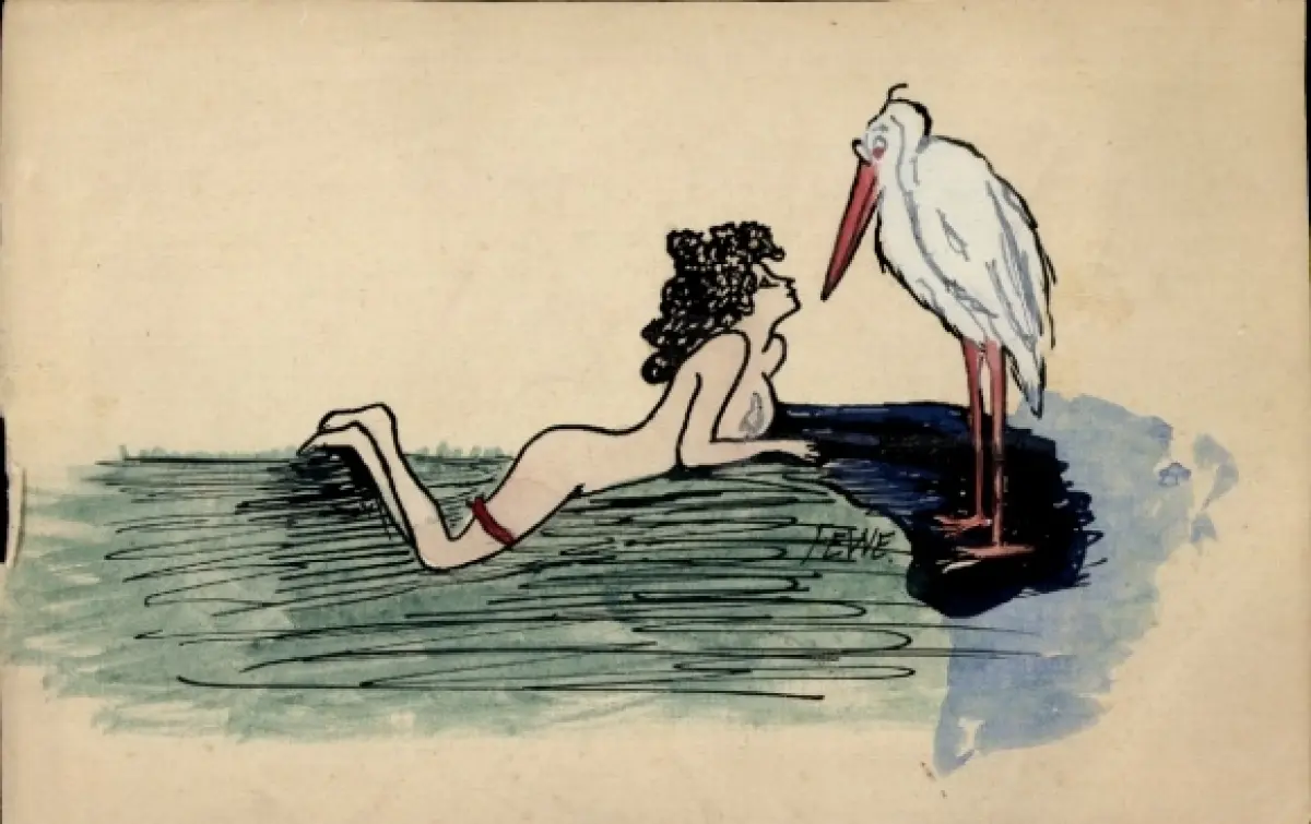 Handgemalt Künstler Ak Nackte Frau, Storch, Erotik