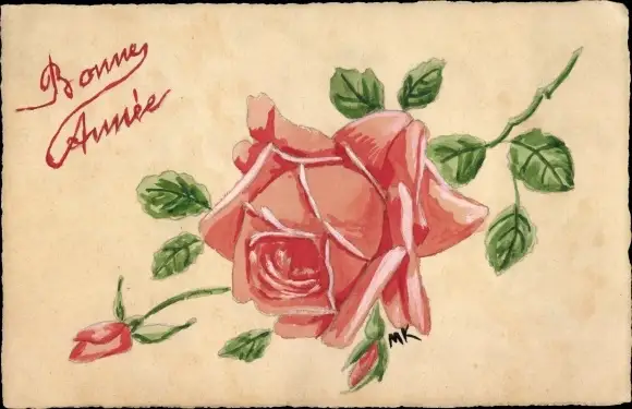 Handgemalt Litho Glückwunsch Neujahr, Blühende Rose